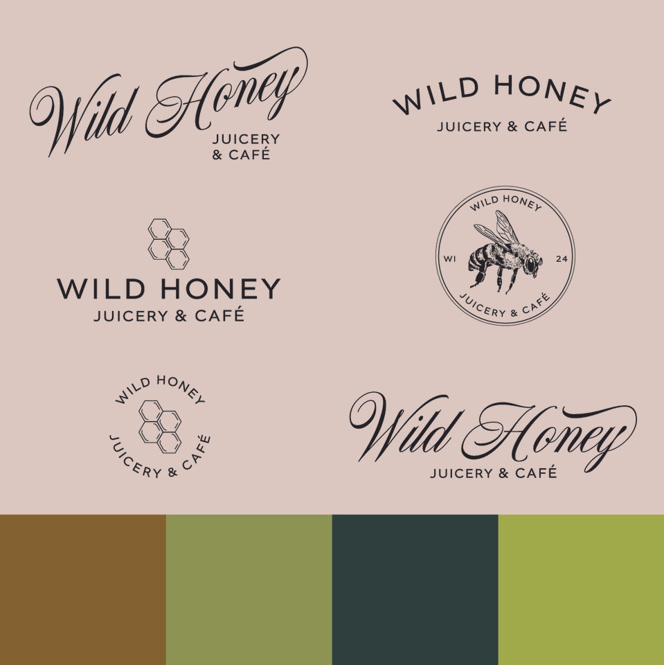 Through partnering with Goodnature and Wild Honey Juicery & Café, we developed a brand identity for a business that aims to feel sophisticated while nourishing its community. The name 'Wild Honey' derives from one of the founder's favorite songs, and they specifically requested bumblebee and honey imagery with a extensive yet cohesive color palette. Wild Honey's signature bee was hand drawn, then paired with an elevated script and simple san serif for balance. Other supplemental images include honeycomb and leaves, which have been incorporated into packaging and patterns. The founder knew they wanted deep green and gold, but found themselves also wanted pops of bright greens and red to give the brand some liveliness. The finalized visual identity is well rounded and adaptable for all of Wild Honey's needs as they launch their space.